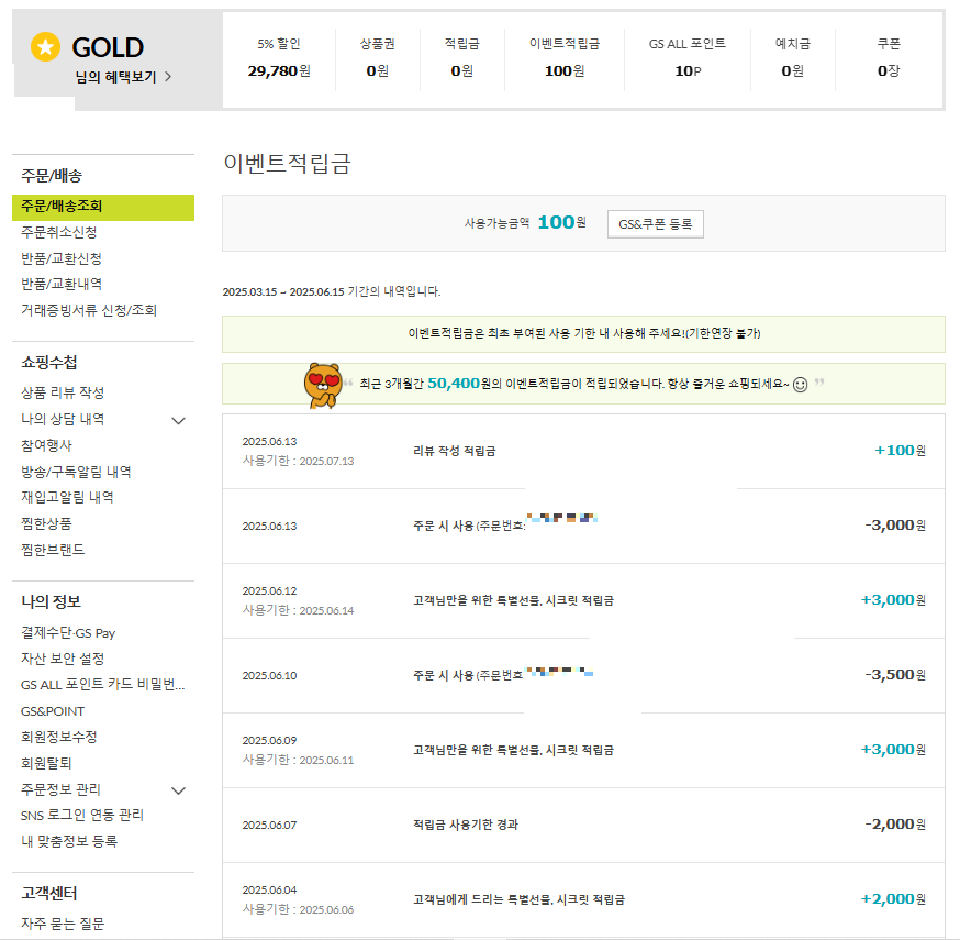 gs shop 최근3개월 이벤트적립금 50,400원